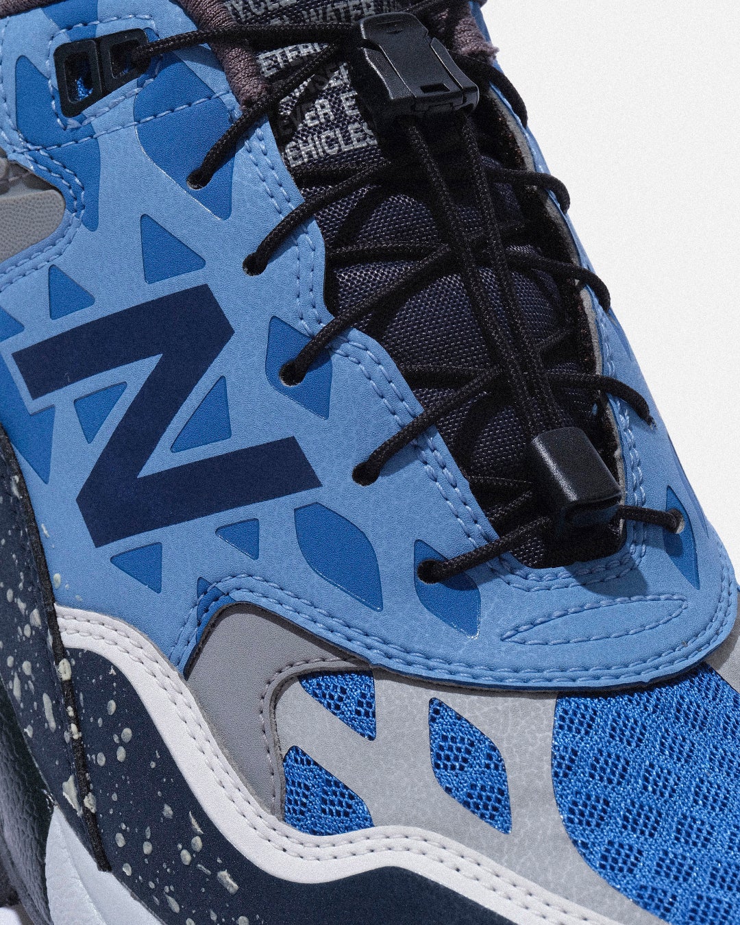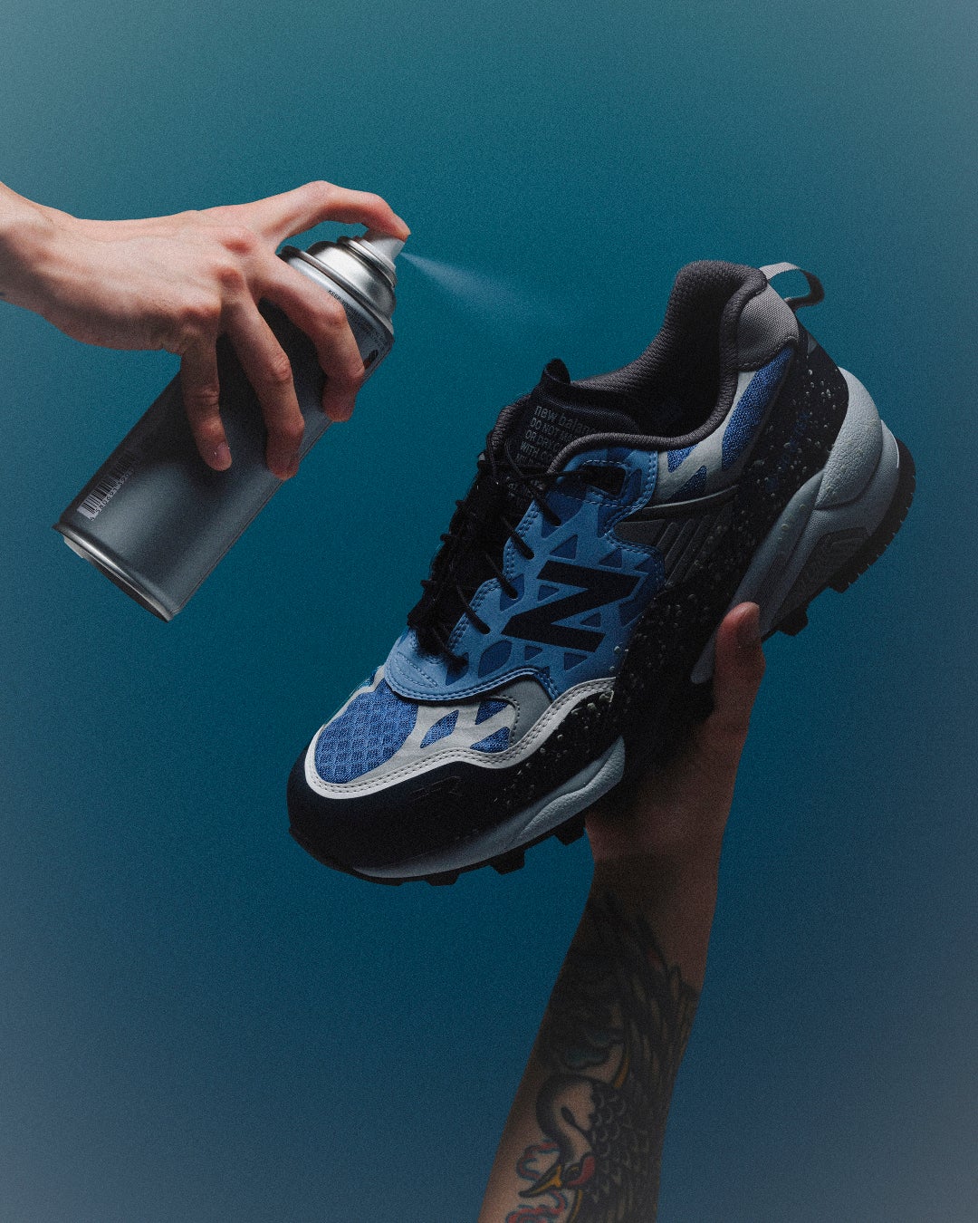 雨天時後や日々のライフスタイルで使用したGORE-TEXスニーカーをメンテナンスし、大事に履く1足として、シューケアブランドの「MARQUEE PLAYER」と取り組み、長い期間活躍するニュースタイルの提案いたします。「MARQUEE PLAYER」の代表的な製品である「For SNEAKER WATER+STAIN REPELLENT」から着想した“GLOW IN THE DARK(グローインザダーク)”仕様のスプラッシュプリントを大胆にあしらい、タンのテキストは580のタン裏に表記されていた注意書きをサンプリング。インソールには、「mita sneakers」のアイコンである「CHAIN LINK FENCE(金網)」と“東京改”、「MARQUEE PLAYER」が展開するスニーカー用撥水撥油スプレーのノズルヘッドのグラフィックをそれぞれ左右に配置しました。